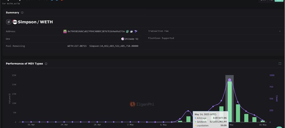 在这里我推荐给大家一个工具Eigenphi,大家可以将自己想要交易代币的交易池地址输入,可以看到Eigenphi为大家统计的MEV交易量,从而去估算一下真实购买意愿的交易量,进一步去横向对比各个MEME代币之间的情况。