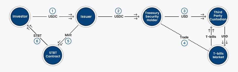 发行方,一般为项目方设立的主体在链上部署的智能合约。投资者投入?USDC,合约根据规则和设定的价格发行对应的国债代币。