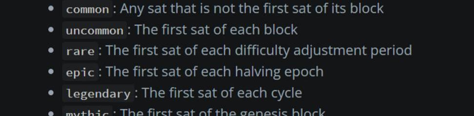 鉴于铭文是使用序数理论刻在单个聪上的,于是每个聪又按编号被划为了不同的珍惜档次。BRC-20的另一个热点就是寻找那些稀有的聪,对收藏家非常有吸引力,例如那些收集编号小于100k的铭文或区块减半后的第一个铭文等。