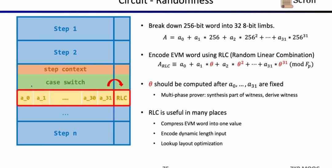首先是电路中的随机性,因为EVM字段是256位,我们需要将其拆分成32个8位的字段,从而更高效得进行范围证明。随后我们使用随机线性组合(RandomLinearCombination,RLC)的方法,利用随机数将32个字段编码成1个,只需要验证该字段就可以验证原始的256位字段。但是问题在于随机数的生成需要在拆分字段之后,才能确保不被篡改。