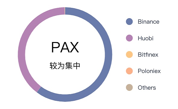 从筹码分布来看,PAX主要集中在币安和火币两大交易所中,其中币安的市场份额为60.11%,火币为33.03%。