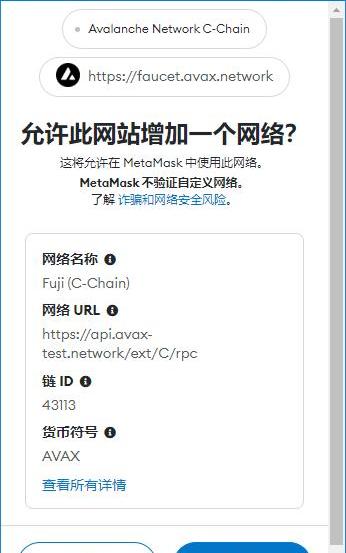 如果上述步骤里无法成功在小狐狸添加跳转雪崩测试网,可以去Chainlist,连接钱包,勾选IncludeTestnets,搜索框搜索Fuji,检索出来后选择AvalancheFujiTestnet,再点击AddtoMetamask,钱包里进行确认即可。