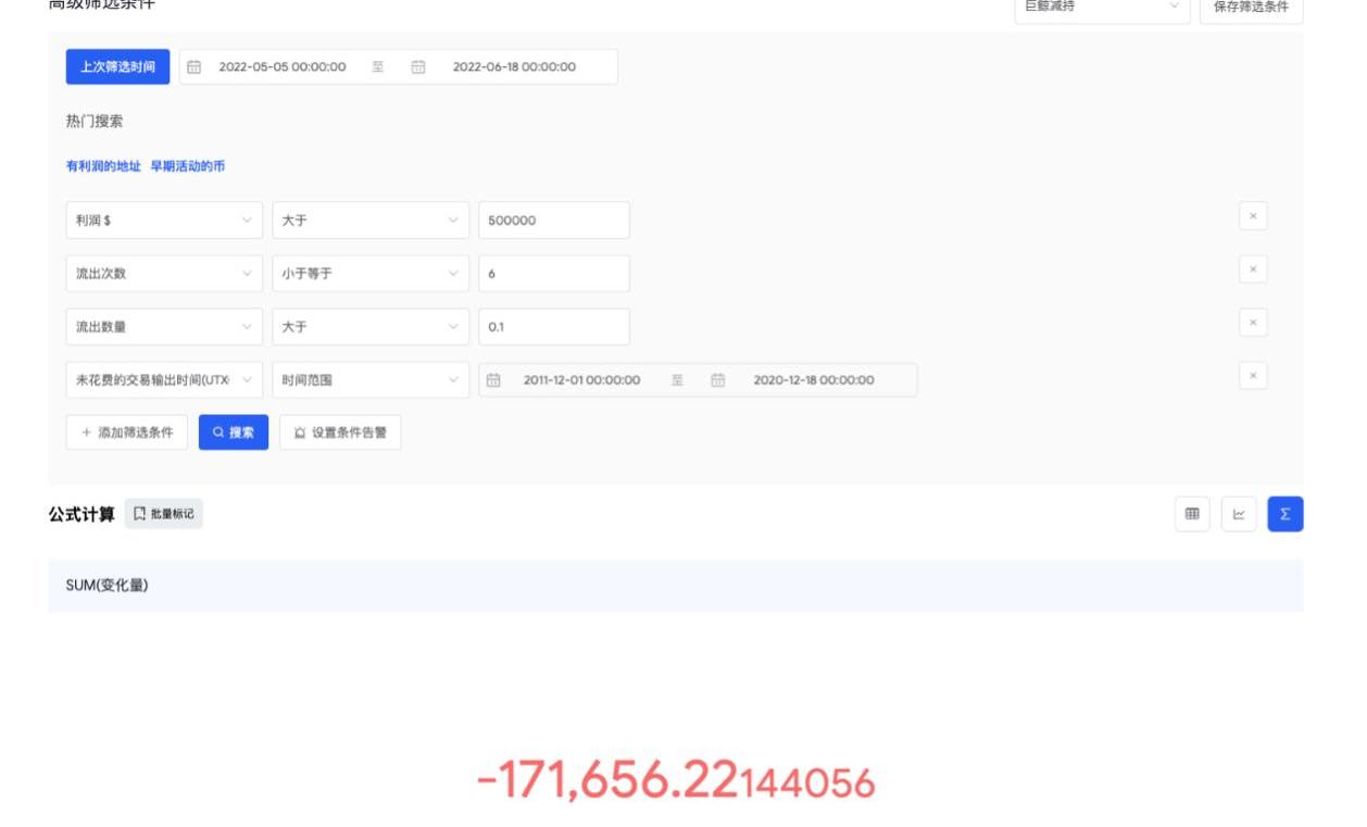 我们再来看看有多少鲸鱼在进行囤币,在设置了如图的筛选条件之后,2022年1月1日到2022年6月15日,链上满足“囤币鲸鱼”条件的共有17,000枚比特币,如图13;2022年6月15日到2022年12月15日,链上满足“囤币鲸鱼”条件的共有97,000枚比特币,图14。
