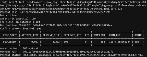 如果我们切回 Alice 的节点终端,就可以得到付款请求并将它作为参数传递给下方命令: