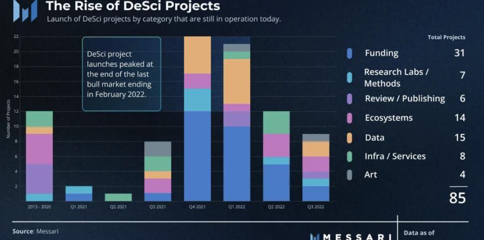 DeSci是一个新兴的生态系统,尚未经过实战考验。大多数DeSci项目(78%)是在过去一年半开始的,从2021年第四季度上一轮牛市的高峰期开始。项目启动的激增恰逢2021年10月在LisCon期间的以太坊会议上举行的第一个DeSci赛道。