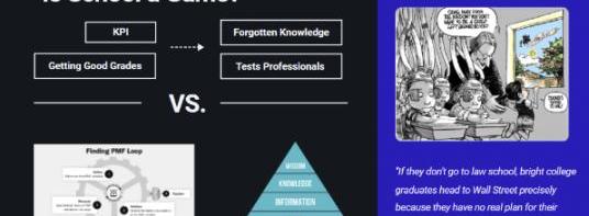 在这让我们思考一个问题:游戏可以取代学校吗?尤其是亚洲的一些学校,非常注重成绩和KPI。很多学生通过像测试机器人一样训练来取得成绩。但事实上,你甚至可以电脑或者手机上通过互联网学到从小学到大学所有的知识。知识的衡量方式被成绩来束缚,但是否掌握并熟练使用才是社会所需的。尽管有弊端,但这仍然是一个成熟的制度。我们相信这种制度上的创新会更进一步提高生产力。比如数据→信息→知识→智慧的知识获取途径的优化。