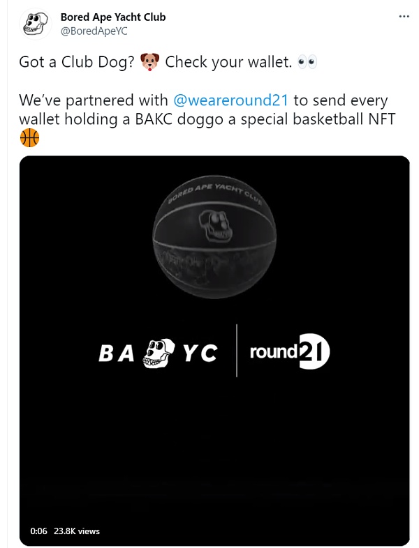2021年7月28日,BAYC官方公告,向所有持有猿猴宠物狗的账户空投一个篮球NFT,同此前的帽子一样,可以通过NFT购得两个实体篮球;