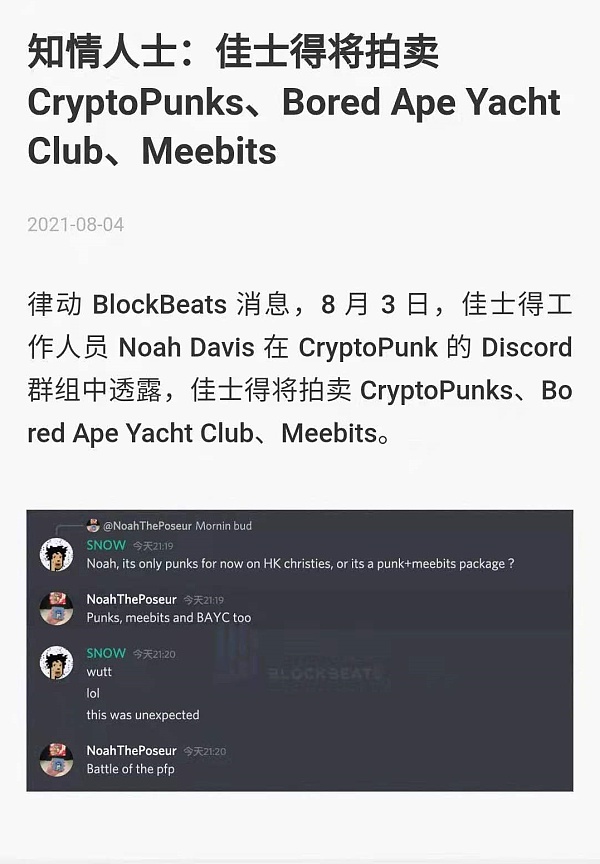2021年8月3日,一则佳士得将拍卖Cryptopunks、BAYC、Meebits的消息在各大NFT社区流传,这则消息彻底点燃市场,BAYC地板价格从5ETH左右一路飙升至10ETH。8月6日,佳士得官方发布公告,证实了此消息并非空穴来风,宣布将于9月17日开启NFT拍卖,拍卖标的正是Cryptopunks、BAYC与Meebits,此时,BAYC地板价格已来到15ETH,猿猴宠物地板价达到2.8ETH。