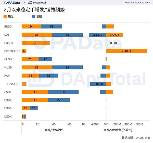 除此之外,其余稳定币在2月以来的净增发均为负,其中TRC20-USDT缩水2.16亿美元,PAX缩水0.26亿美元,DAI、NUSD、GUSD和USDE也都缩水10万美元以上。