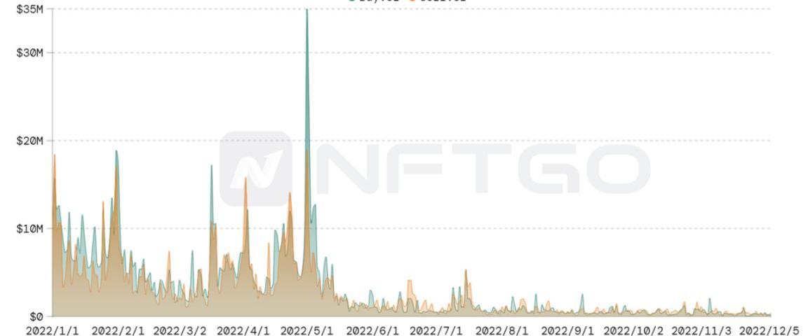 在5-6月份,受到总体市场的影响,巨鲸大大缩减了在NFT市场上的资金流动规模,买入资金和卖出资金开始从6月的3000万美元稳步下跌至12月的1000万美元,趋势线呈线性下降的形状。