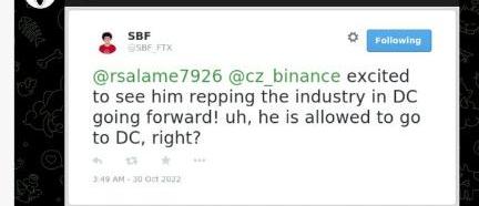 当时的SBF还非常咄咄逼人,甚至嘲笑自己可以随意进出华盛顿,而赵长鹏却不行,但他之后删除了相关推文。