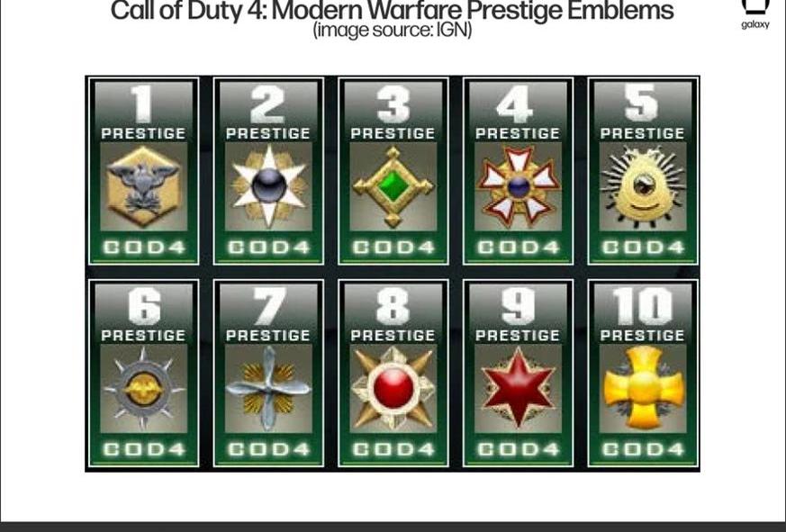 最初由InfinityWard为CoD4设计-->Prestiging,玩家可以通过声望徽章来显示地位。