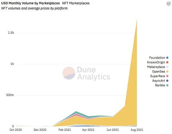 Dune Analytic 数据显示,OpenSea在 8 月 29 日的单日交易量超过?3 亿美元,月内交易量达到近 30 亿美元,环比激增 8 倍,本月平台活跃用户数量也达到了 20 万人。