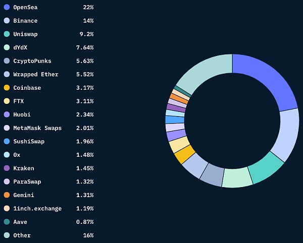 半年前,没有人会想到 OpenSea 最终会在以太坊Gas Tracker排行榜上名列前茅,并与 Uniswap一争高下。 今天,OpenSea 是第二大gas消耗应用,经常占据整个gas消耗市场的 10-20%。 OpenSea是目前最大的 NFT 二级市场。 项目方或艺术家在铸造加密艺术项目的 NFT 后,它们开始在 OpenSea 上交易,随之而来的其他收藏家开始挑选并竞标他们喜欢的 NFT作品。