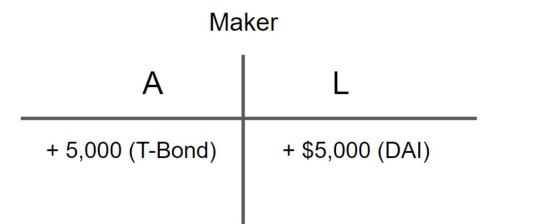 那么,如果此时Maker购买了$5,000的美国国债,这是一种什么行为呢?在这里,Maker作为算法央行,无论它购买国债所需要的5,000DAI是从财库里取出,还是增发的,在Maker资产负债表中的反映都是一致的: