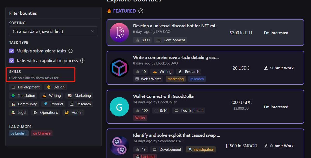 用户可以通过Discord登录,然后绑定钱包,通过点击「OpenBounties」来查找正在进行的悬赏活动,此外用户还可以根据自己的技能,筛选适合自己的任务,如writing、Research、Translation,同样Dework平台也会根据用户提供的优势技能推荐任务。