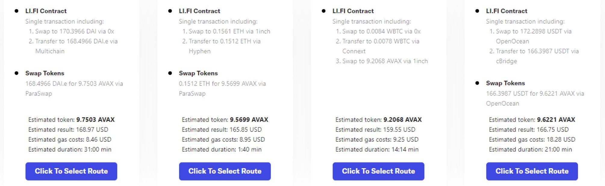 LI.FI选择的是可兑换最多目标代币的路径,虽然该路径并非Gas最低的路径,但综合交易时间以及兑换的目标代币数量,性价比是最高的。当然,LI.FI也提供了可选的路径让用户自行选择,满足额用户对特定的DEX或跨链桥有交互需求或对时间有特殊要求等情况。