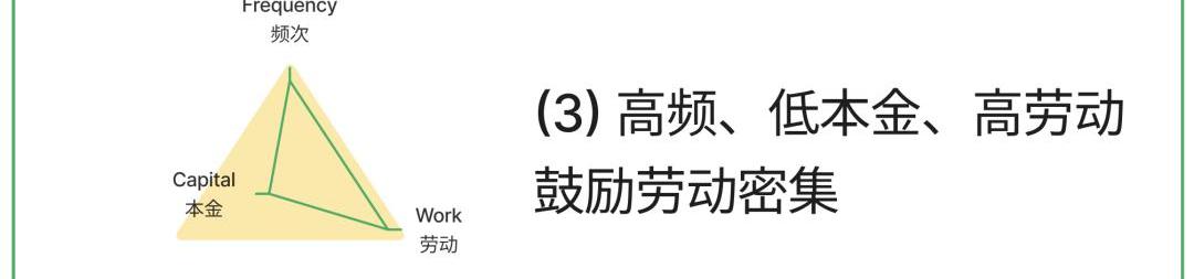 在最后两种「低频,高本金,低劳动」和「低频,低本金,低劳动」场景中,参与者贡献的价值过低,我们认为这样的场景暂时不具备意义。