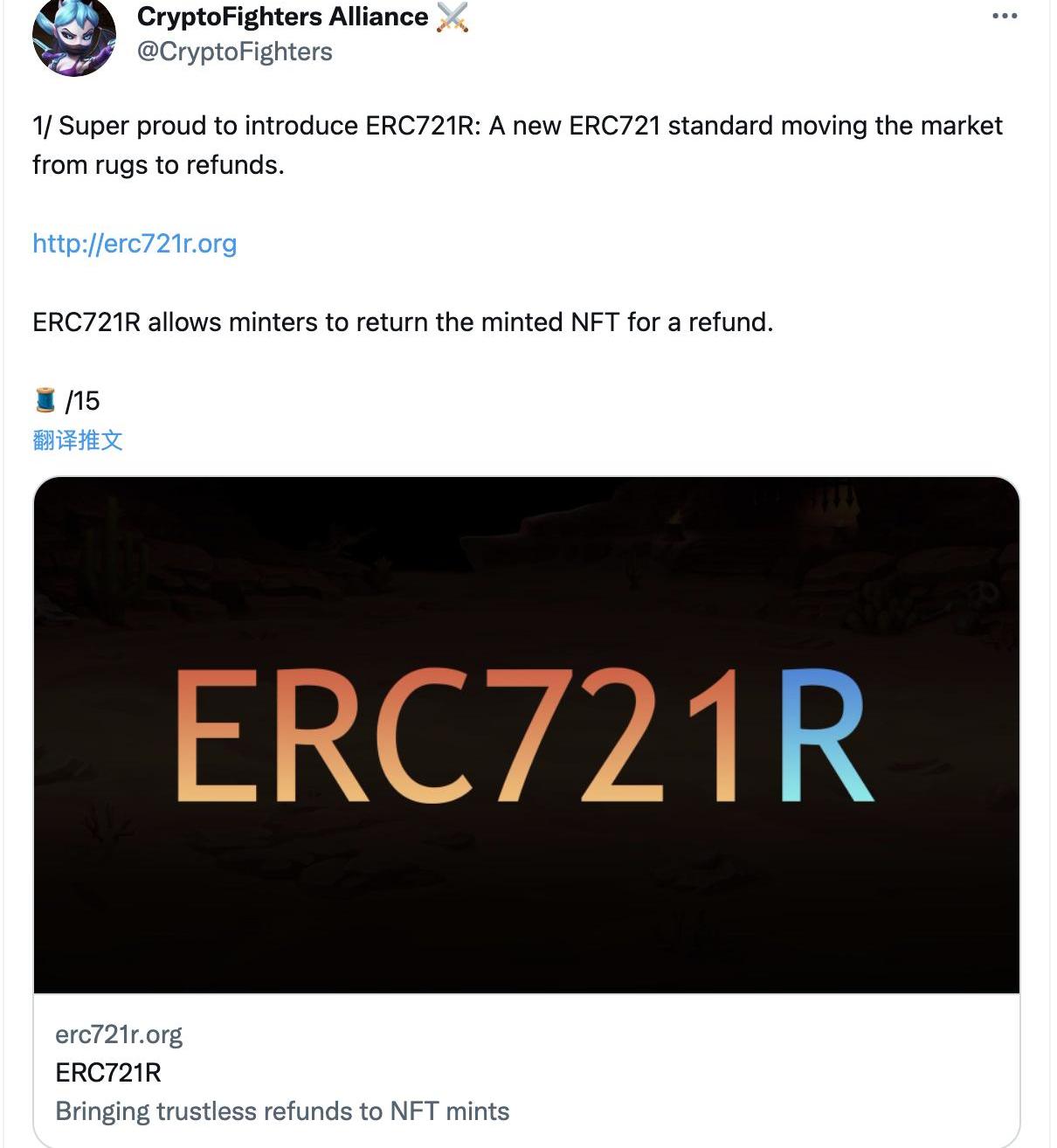 GameFi项目CryptoFightersAlliance今日在官方推特上介绍了一个名为ERC-721R的新标准,该标准旨在为ERC-721和ERC-1155标准增加退款功能。简单来说,使用ERC-721R这一新标准的NFT项目可以为用户提供「N天无理由退款」的功能,而这将有效地降低项目方跑路造成用户损失的风险。