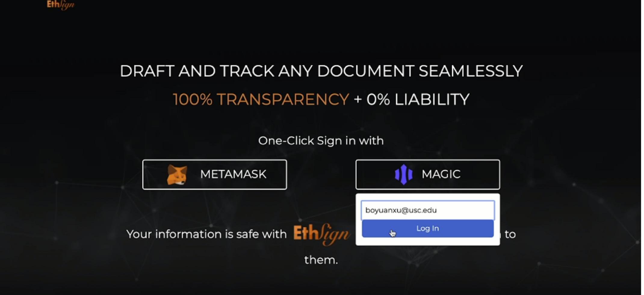 后来我们找到了在菲律宾的Nicole和专业学交互设计的Claire,我们的前端才变得没那么Hackthon。后来我们终于在今年2月的DorahacksHackathon上展示了EthSign的第二个版本,那时我们已经开始注意去集成Magic来让传统用户通过邮箱账户建立加密货币钱包;并且随着以太坊的暴涨,我们不得不把智能合约迁移到Matic上以减小用户的Gasfee消耗。??