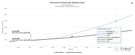 众所周知,传统区块链所存储的数据是繁杂的。我们以以太坊为例,据 etherscan.io 数据显示,以太坊全节点 GETH 的存储数据规模已经达到 985GB,接近 1 TB。而在去年十月,GETH 的存储数据规模只有 500GB 左右。随着以太坊的采用量增加,只用了一年时间,以太坊全节点数据便翻了一倍,未来随着 DeFi 生态的扩张,以太坊的存储数据将会越来越多。