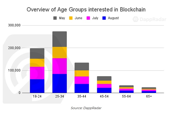 正如预期的那样,千禧一代和Z世代引领着区块链的发展,尽管最近在较年长的年龄段的调查结果确实对更广泛的采用感到鼓舞。我们也很高兴看到女性观众的参与度逐月提高。