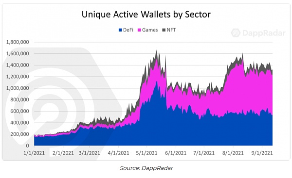 行业的兴趣正在转向游戏,连接到游戏dapp的独特活跃钱包的数量按月增长了64%,而同期DeFi和NFT的独特钱包仅增长了3%和6%。