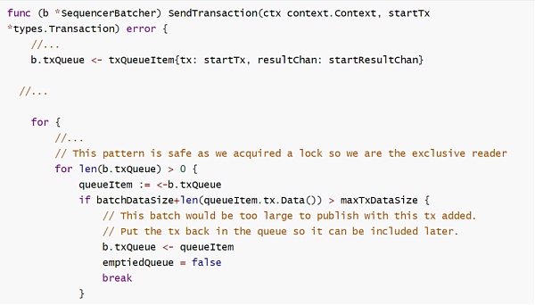 根据Fairyproof Tech的漏洞检测系统显示:出现本次内存泄露问题的代码在SequencerBatcher.SendTransaction()函数中。其具体代码片段如下: