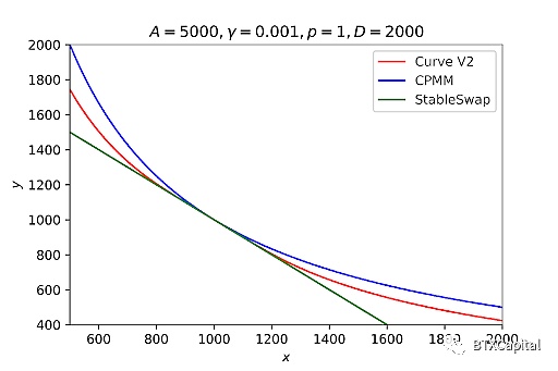 与CPMM和StableSwap相比,Curve V2的价格函数: