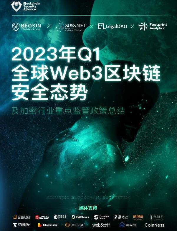 2023年第一季度,据区块链安全审计公司Beosin旗下BeosinEagleEye安全风险监控、预警与阻断平台共监测到Web3领域主要攻击事件61起,总损失金额约为2.95亿美元,较2022年第4季度下降了约77%。2023年第一季度的总损失金额低于2022年的任何一个季度。除攻击事件外,2023年第一季度还监测到主要RugPull事件41起,涉及金额约2034万美元。