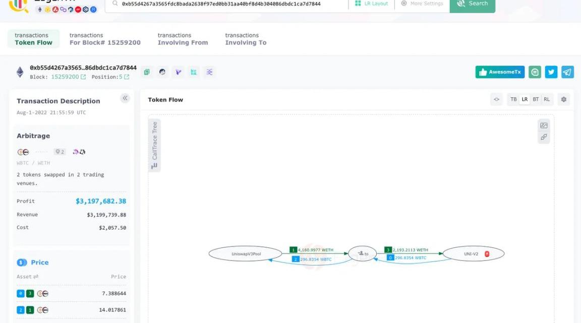 2022年8月1日,套利机器人0xbaDc从两个UniswapWETH/WBTC池之间的单一空间套利中获利319.7万美元,花费2057美元成本,在Nomad跨链桥漏洞中反向运行大型交换交易。