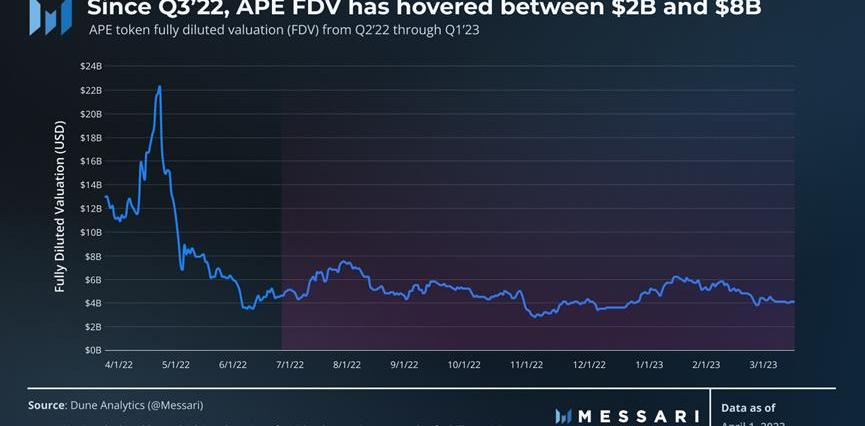 APE的历史最高(ATH)估值超过220亿美元,最低估值从未跌破20亿美元。虽然ApeCoinDAO的估值从未低于独角兽地位,但目前还不清楚该项目能提供什么。其他估值相对较高的加密项目倾向于提供有形产品,如提供数据存储的Arweave或提供云GPU渲染的Render。但加密项目的相对估值还是高于具有类似产品的传统项目,这可能是因为去中心化带来的巨大扩展潜力和安全优势。ApeCoin只是一个不断消耗国库基金的DAO。它既不像许多提供产品的加密协议那样方便去中心化组织提供服务,也不像传统公司那样产生收入或拥有固定资产。相反地,APE的主要用例将是作为YugaLabs的新元宇宙游戏Otherside的交易媒介。因此,它目前的价值可能是基于这样一种信念,即这款游戏将吸引大量用户,未来APE会被广泛使用。自22年第三季度以来,APE的FDV一直徘徊在20亿美元至80亿美元之间。23年第一季度没有低于35亿美元。与更广泛的加密市场相比,APE在2023年第一季度的价值保持得相对较好,尽管比ATH下跌了70%以上。此外,FDV季度环比增长20.6%。APE的流动性供应