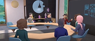使用 Oculus Quest 2 设备登录,在家工作的人们可以通过虚拟方式参加会议,并且享受身处同一个房间的感觉。在此平台中可以最多 16 人可以一起在一个工作室中,而另外 34 人可以在不戴AR/VR设备的情况下通过视频通话加入。而会议室的面板则可以实时连接我们的计算机屏幕进行展示。