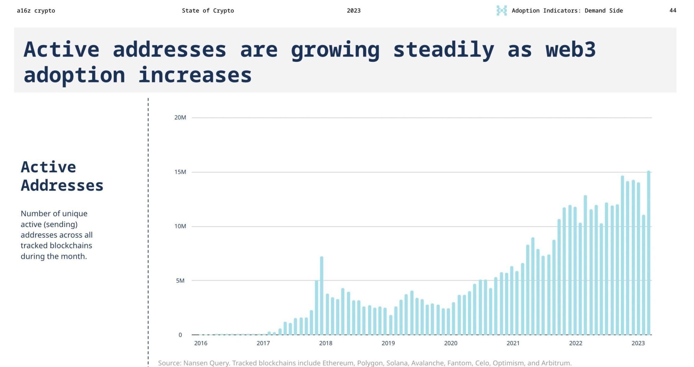 今年的价格已经从2021年的令人眼花缭乱的高点稳定下来。这个行业似乎正在稳定下来:投机活动已经冷却,人们如何持久、有机地使用Web3并与之互动的故事正在开始展开。我们看到每月的活跃地址——每月在链上交易的独特地址——比以往任何时候都多。上个月,我们看到1500万个发送地址,是两年前价格仍然高涨时的两倍多。一个可能的解释是:参与区块链和Web3应用程序的方式越来越多。从DeFi到Web3游戏——其中有700多个在去年推出——各种新的应用程序为其用户创建了地址来进行互动,而不需要下载或连接钱包。