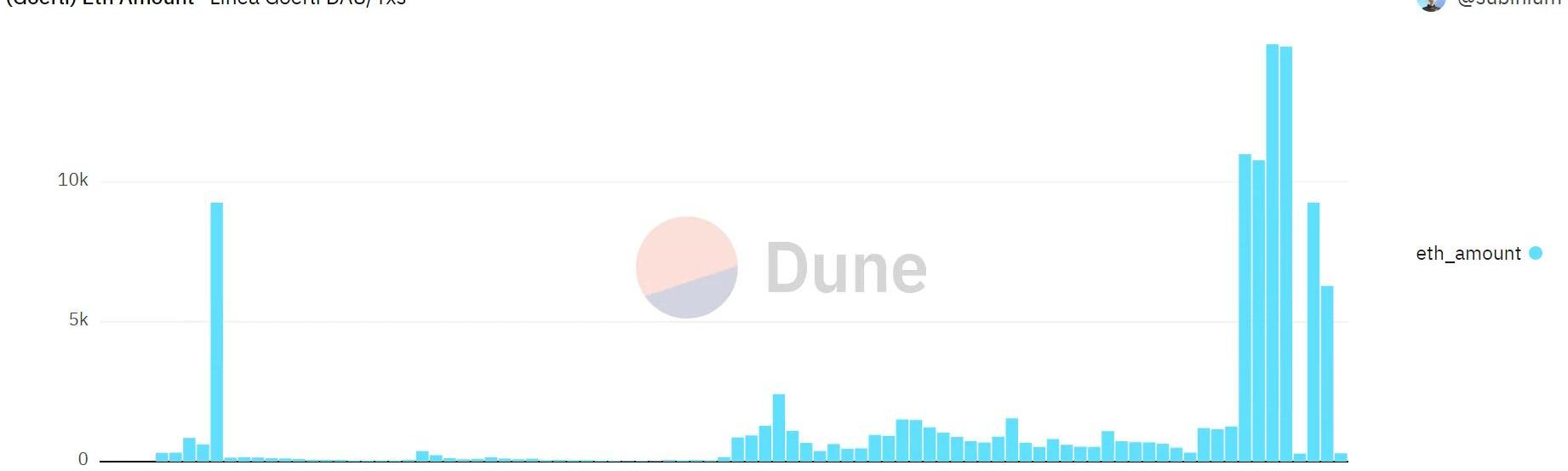 图10.UniqueContractsDeployed近期,除了PolygonzkEVM主网上线热度高涨之外,Consensys也开放了其zkEVM项目Linea的测试网。上周,Linea均有单日超过1万枚GoerliETH流入,创下新高。目前Linea链上共有超过11万个地址,存入了约11.5万枚GoerliETH,完成了超过59万笔交易。Linea的交互与Scroll类似,需要去获取Goerli的测试币。目前,用户可以交互的应用比较有限,包括跨链桥hop,DEX:Uniswap、MESprotocol,NFT:ghostNFT。