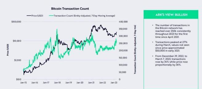 比特币网络的交易数量在2023年保持在25万以上,是自2021年4月以来的首次。比特币交易量在3月达到峰值27.7万,这是自2021年初价格接近50,000美元以来的首次。从2022年12月29日到2023年3月7日,交易量上涨34%,价格上涨36%。比特币一年持有量达新高