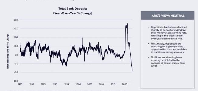 储户大举提款,导致银行的存款急剧下降,这是自1948年以来最大的同比下降。储户在寻找比传统储蓄账户更高的收益机会。资金外流导致银行偿付能力承压,间接导致硅谷银行倒闭美联储迅速行动应对金融动荡