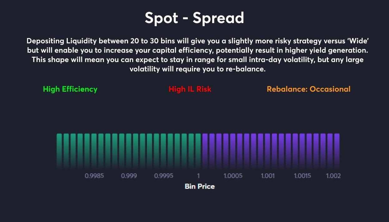 2)Spot-Spread:平均分配流动性到20-30个桶,资本效率不错,前提是价格的波动区间要在设定的范围内。如果偏离的话会有较高IL。适合短期在某个价格来回震荡的币种。