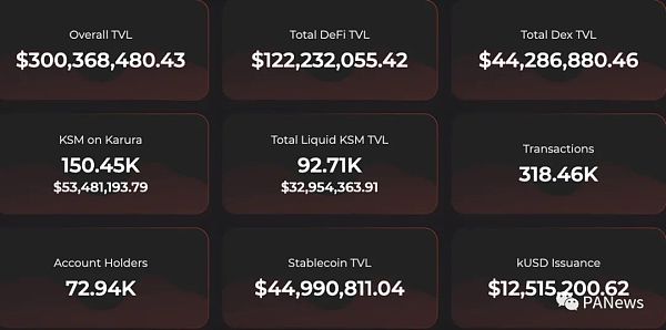对于Karura生态发展的情况,可从其网络整体数据表现窥探一二。截至10月18日,Karura全网锁仓总价值(TVL)已超过3亿美元。其中,DeFi的总锁仓价值超1.2亿美元;DEX在仅支持3种原生资产的情况下总锁仓价值已超4428万美元;稳定币的总锁仓价值达4490万美元。同时,Karura的账户总数近7.3万,kUSD的发行量超1251万枚。此外,大约有15万枚KSM跨链至Karura网络,价值超5348万美元。