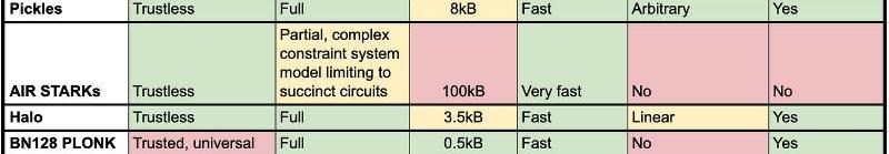 这个表格提供了SNARK实现的良好比较,并介绍了它们在速度方面从Groth16到Plonk再到Halo的进展情况。尽管有所进展,STARK仍然在证明速度方面胜出,但代价是更大的证明大小。该表还讨论了证明系统的两个重要特征:设置无信任性和电路可编程性。设置无信任性部分讨论了电路创建的预处理阶段。一些证明技术需要通过多方计算参与,在预处理阶段生成秘密随机数。如果单个参与者是诚实的,则生成的随机数确实是秘密的,预处理部分是安全的。这个过程称为“信任设置”,因为它信任至少一个预处理阶段的参与者是诚实的。需要信任设置被认为是一种弱点。在这个意义上,STARK和新的SNARK系统具有优势。然而,一些项目将信任设置作为吸引社区参与的工具,例如Aztec和Manta。可编程性部分讨论了证明系统是否可以证明任意计算。SNARK通常可以对任何计算进行编程。然而,证明效率取决于所执行的计算类型。对于某些类型的STARK系统来说,这并不是适应不同类型计算的容易的情况。