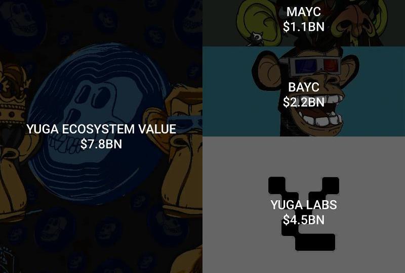 在Otherdeeds销售之前的几天,BoredApeYachtClub、MutantApeYachtClub和$APE代币的交易价格均创下历史新高。BAYC拥有惊人的约40亿美元的市值,MAYC已达到约20亿美元,而$APE代币的市值为65亿美元。YugaLabs在不到两年的时间里,成功将一万个没有任何实用性的猴子JPEG转化为一个价值数十亿美元的帝国!值得注意的是,NFT收藏品的市值是根据底价乘以流通供应量计算的,因此如果有人想一次性购买所有流通的Yuga生态系统资产,实际估值可能会低得多。