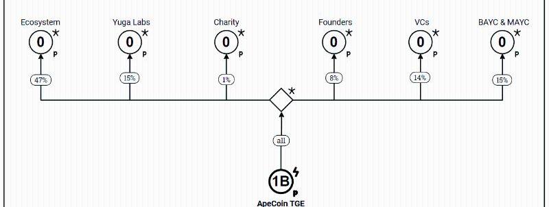 初始代币分配的设计是将47%的代币分配给生态系统,15%分配给YugaLabs,1%分配给慈善事业,8%分配给创始人,14%分配给风险投资,15%分配给BAYC和MAYC持有人。我们对于Yuga生态系统利益相关者的定义在代币中分配了总共52%的代币。让我们看看这52%中的分配情况: