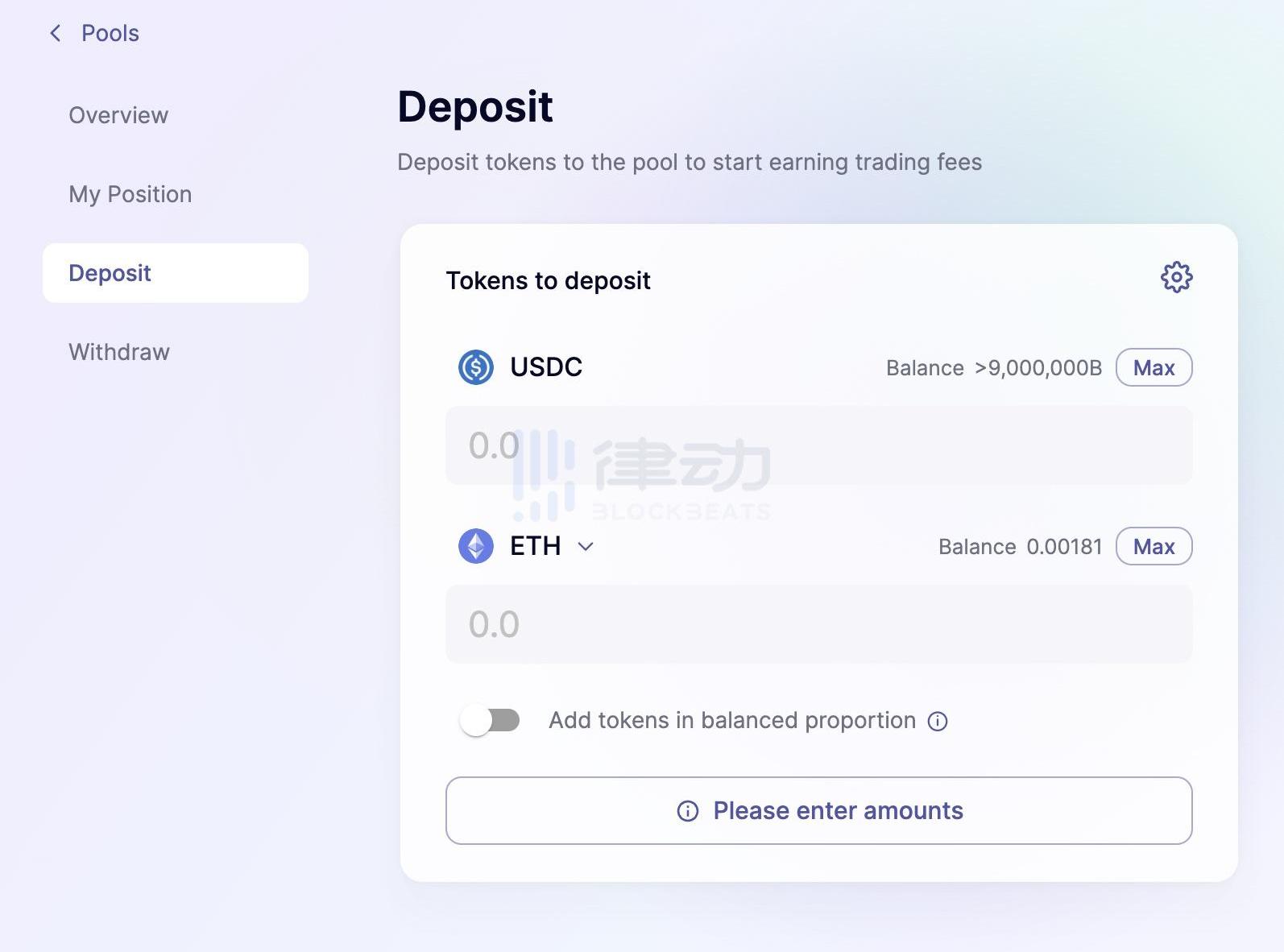 点击Deposit存入ETH与USDC,添加流动性。BLockBeats注:首次使用该功能需要授权解锁USDC然后才可以进行Deposit。