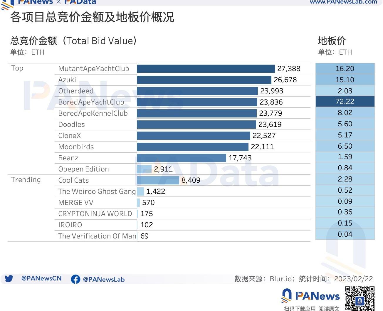 2月15日凌晨,NFT交易平台Blur进行了第一轮空投,向超12万地址共空投3.6亿枚代币,有超12万地址。按上线当天价格算,有5835个地址获得了1万枚以上,约获利超6500美元,还有23个地址获得了100万枚,约获利65万美元。目前,第二轮空投已经开启,尽管激励细则还未公布,但在4月1日之前,所有出价和上架行为都将获得双倍积分。在第一轮“造富神话”刺激下,不少人都将视线转向了“刷积分”,这为NFT市场带来了久违的活力,交易量不断攀升。Blur的连续空投计划,以及其背后牵连的Bidding与Points机制将会为NFT市场带来怎样的变化?PANews数据专栏PAData将结合近期NFT交易市场数据和Blur的交易数据集中讨论以下问题:在宏观层面,Blur空投对整个NFT交易市场而言,是刺激了“消费者剩余”,还是抢占了其他交易市场的“蛋糕”?在微观交易层面,越接近地板价的Bidding能获得的Points越高,这是否会推动NFT价格下行?不同项目的出价深度有何区别?高积分用户是如何通过Bidding和Listing行为积累积分的:他们主要Bidding什么项目?出价策略是什么?目前的预估营收情况如何?数据分析显示:Blur刺激了新的交易需求。15个交易市场最近一周的日交易量涨幅达到229.05%,日交易地址数涨幅约为19.46%。Blur的日交易量为涨幅达到467%,日交易地址数涨幅为46%。在最近的市场增量过程中,Blur对其他多部分交易市场都形成了挤压,在交易量方面尤为明显,在用户规模方面压力较小。这也在一定程度上说明,Blur在此次增长中吸引了更多“高净值”用户。10个头部项目的竞价深度在地板价和高于地板价1%的范围内最佳,6个热门项目的竞价深度在低于地板价5%的范围内最佳。Points规则发挥了预期的作用,使出价价格向地板价靠。根据统计,Blur上最近7天交易量最高的100个项目,最高出价偏离地板价的平均幅度约为0.72%。这最终使得地板价便有了下行动力。交易量前100的项目,在Blur上的地板价较在Opensea上的平均低4.97%,在Blur上的7天交易量较Opensea上的平均高0.59%。但跨市场层面不存在量价关系,即Blur上更高的交易量与地板价高低无关,地板价更低主要受到Bidding-Points机制影响。对于头部项目而言,Blur上的地板价全部低于Opensea,尤其是BoredApeYachtClub和Doodles,分别低了9.98%和6.51%,这也解释了为什么这两个项目的竞价深度集中在地板价以上5%的范围内。被3个及以上高分用户出价的项目有17个,其中,PudgyPenguins、Moonbirds、CloneX和BoredApeKennelClub被8个高积分用户出价过。10个高积分用户有效出价总次数约6.27万次,平均出价偏离地板价的幅度约为-16.32%,平均出价执行率约为92.87%。其Bidding模式可以大致分为三类。10个高分用户目前持有的NFT,按照地板价估算后的总价值都低于成本,即当前都处于预估亏损状态。平均预估亏损90ETH,相当于14.49万美元。想要获得高积分,是需要投入较大资金成本的,并且,在积分规则的鼓励下,Blur市场上的地板价有下行动力,这使得参与Bidding的用户需要持续地、动态地管理自己的成本-预估价值差,这个差距的管理标准应该是对空投价值的预期。Blur刺激新交易需求,15个交易市场中12个的交易量都有增长