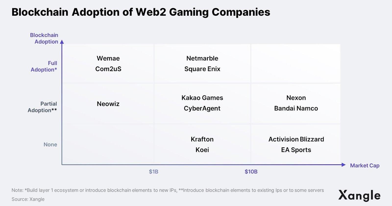 SquareEnix是一家领先的日本游戏公司,其核心IP最突出的包括《FinalFantasy》和《DragonQuest》。与过去该公司利用其核心IP生产主机游戏系列不同,它已成功转型至移动端,其移动游戏收入现已占游戏总收入的一半即是证明。在成功转向移动端之后,SquareEnix最近提出将区块链游戏作为中长期增长战略。在2023年的新年致辞中,SquareEnix首席执行官松田洋介强调了区块链游戏的增长潜力——脱离了游戏公司单方面提供游戏的动力,并促进了游戏内用户驱动的增长。目前正在开发中的《Symbiogenesis》体现了这一愿景,其有望成为SquareEnix推出的首款全新区块链游戏。目前透露细节仍然很少,只知道Symbiogenesis将在Polygon区块链上启动,以及其将是一款基于10,000个NFT并拥有自己宇宙的NFT游戏。尽管区块链在其旗舰IP“最终幻想”和“勇者斗恶龙”中的部署尚未敲定,但新年消息似乎预示着可能会从《Symbiogenesis》开始开发和发行更多区块链游戏。在全球100强游戏公司中,约70%位于亚洲。我们调查了这些公司,以分析他们的区块链采用计划。结果表明,韩国游戏公司处于开发区块链游戏的最前沿。