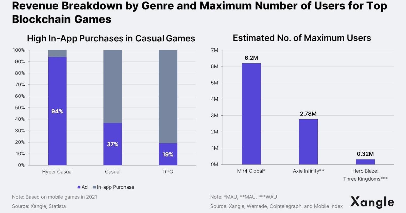 休闲类游戏拥有会话时间短、操作简单的特点,例如最突出的CandyCrush和Anipang。由于整体硬件规格相对较低,亚洲历来更偏爱休闲游戏。HeroBlaze:ThreeKingdoms是2021年围绕P2E概念并在韩国以外走红的游戏,也是一款休闲RPG游戏。目前区块链的可扩展性仍然存在问题,L1和L2区块链的可扩展性水平无法处理大型游戏数千万笔交易,但已能满足相对低规格的休闲类游戏需求。与其他类型相比,设计简单的休闲游戏需要的交易相对较少,并且可以上链。休闲游戏收入中广告收入占据高比例的特点也与区块链相契合。在游戏应用启动或游戏过程中,广告通常以横幅的形式在屏幕顶部或底部出现。RPG游戏意图让玩家在游戏内进行消费支出,而休闲游戏则试图吸引尽可能多的用户,让他们接触广告并向广告商收取费用——因此,游戏的次数越多,广告收入就越高。AxieInfinity、HeroBlaze:ThreeKingdoms和MIR4Global展示了应用内广告和区块链游戏的结合,这些游戏可以快速在亚洲建立重要的用户群,从而产生强大的协同效应。
