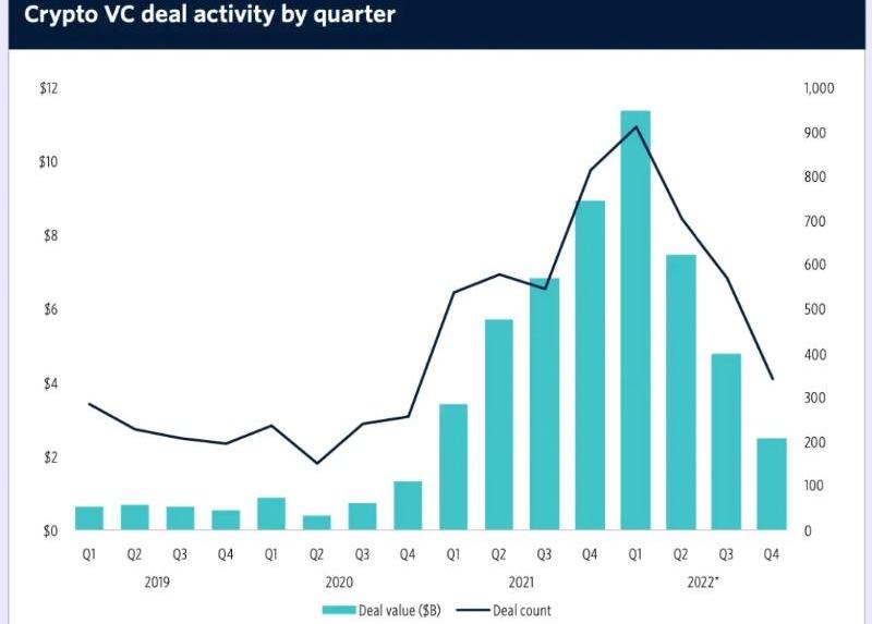 根据Pitchbook的数据,2022年是加密货币/区块链风险投资史上最大的一年,新投资了超过262亿美元,仅略高于2021年的251亿美元。让我们看一下部分图表。