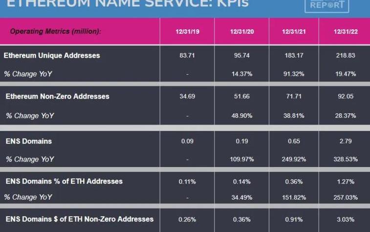 Data:Etherscan,Dune@makoto,Glassnode目前全球有超过9500万个非零以太坊钱包地址。同时,这些地址中只有280万个是使用「.eth」域名,约占3%,差距非常大。我们认为,绝大多数钱包地址将在未来某个时候有望成为人类可读的。当然,我们的假设取决于主流采用与使用情况,即人类可读的钱包成为一种必需品。考虑到已经呈现出的增长率,我们认为是有机会的。在续费方面,链上数据显示平均流失率约50%——用户粘性相当不错。在整体注册增长方面,「.eth」在过去3年每年增长228%。