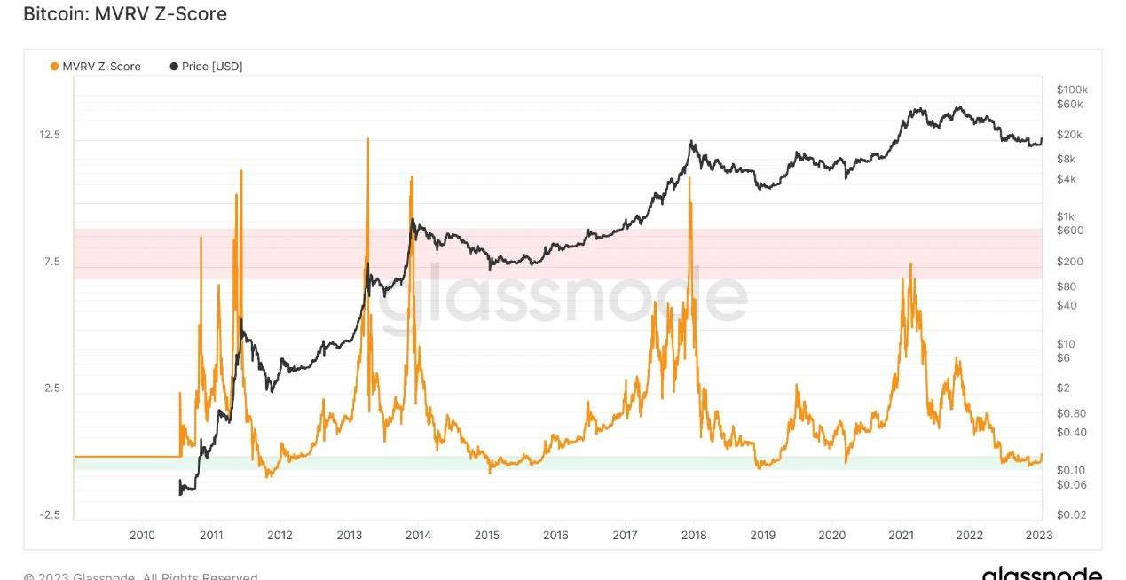 长期趋势指标MVRV-ZScore以市场总成本作为依据,反映市场总体盈利状态。当指标大于6时,是顶部区间;当指标小于2时,是底部区间。MVRV跌破关键水平1,持有者总体上处于亏损状态。当前指标为0.07,脱离了绿色抄底区间。