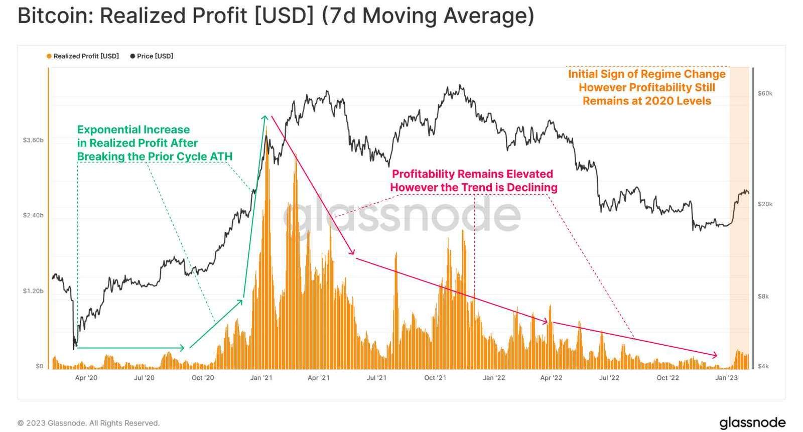 我们将从分析最近一个周期中市场锁定的已实现利润开始我们的调查。我们可以看到,2020年10月份之后,由于货币政策异常,获利回吐现象激增。可以看出,自20211月达到峰值以来,这种情况急剧减少,在接下来的两年内恢复到2020年的水平。最近的价格走势反映出已实现利润的复苏,但对于2021-22年整个周期所经历的繁荣,它仍是暗淡的。